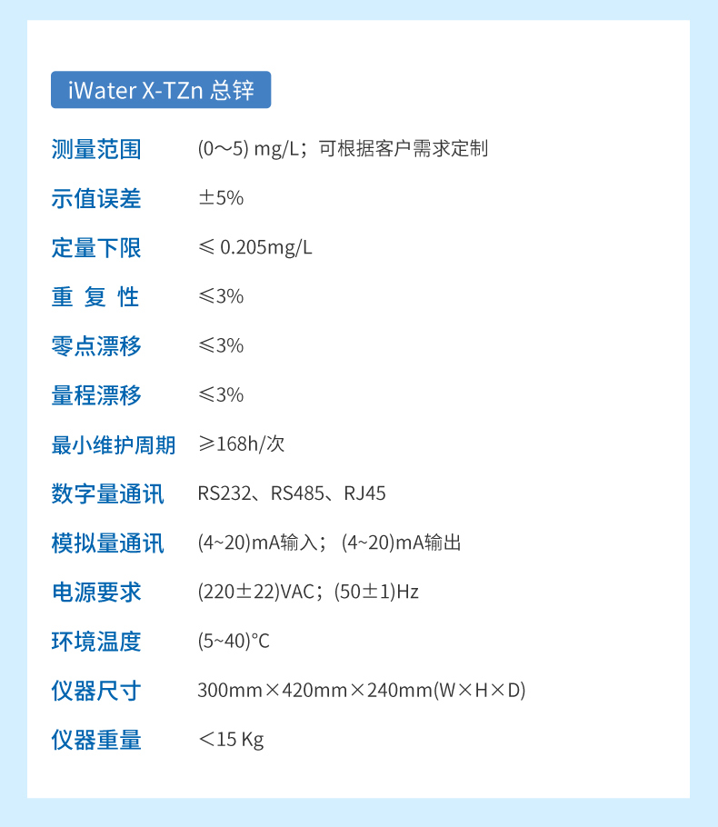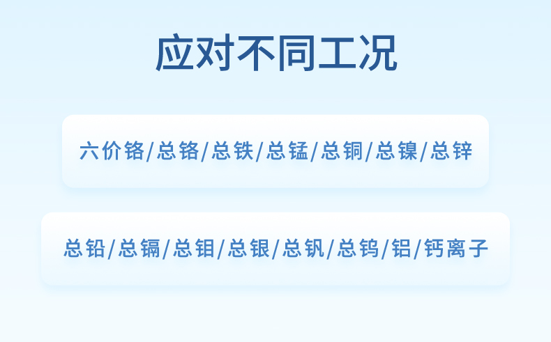 聯測在線水質重金屬檢測儀可監測:六價鉻/總鉻/總鐵/總/總銅/總鎳/總鋅/總鉛/總鍋/總鉑/總銀/總釩/總鎢/鋁/鈣離子。
